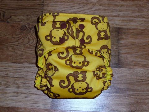 Tämä vaippuli valmistui juuri. Taas tehty Hilivinksis taskuvaipan kaavan mukaan, tosin pistin taakse ja jalanteille pikkuisen pidemmät kuminauhat, jotta vaippa mahtuisi päälle vähän kauemmin.. Päällä vaipassa on ihana omppu-pul ja peppua vasten limen värinen Coolmax.