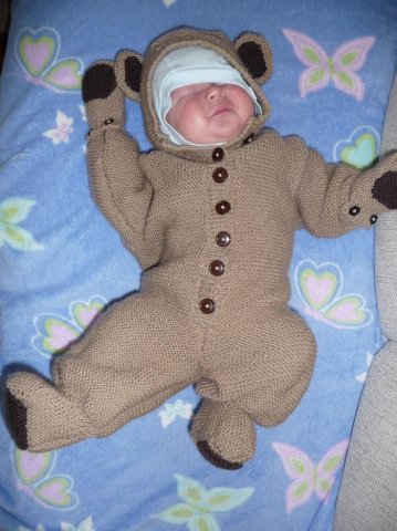 Kuvassa Rasmuksella on päällä neulomani nallehaalari. Haalarin hihat ovat ihan hirveän pitkät, voi olla että lyhennän niitä vielä jossain vaiheessa (jos jaksan)... Aikas vinkeä asento pojalla..! ;)