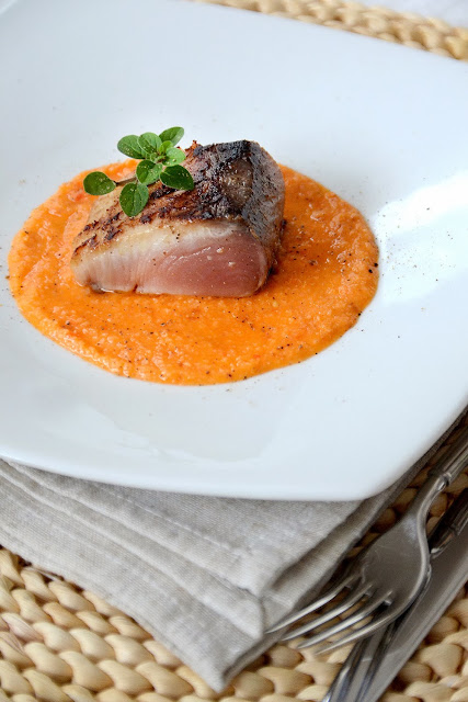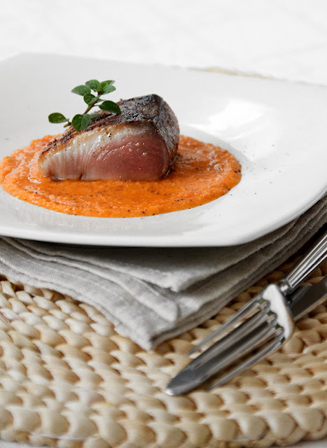 Per l'impiattamento: posizionare un coppa pasta nel centro del piatto, versare la bruschetta liquida, togliere il coppa pasta, dare qualche colpetto con la mano sotto al piatto in modo che la salsa si stenda un poco. Adagiare uno o due bocconcini di palamita sopra alla salsa. Guarnire con un ciuffetto di origano fresco (che andrebbe sfogliato e mangiato insieme alla palamita e la sua bruschetta, è una nota molto fresca, non è solo una guranizione). Una macinata di pepe sarawak, delicato e dal profumo raffinato, un GIRO D'OLIO naturalmente e poi......s'assaggia finalmente!!!