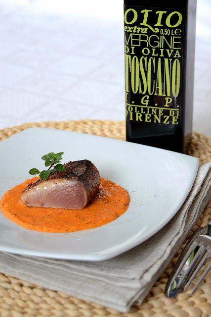 TATAKI DI PALAMITA E BRUSCHETTA LIQUIDA ALL'OLIO NUOVO DELLE COLLINE FIORENTINE