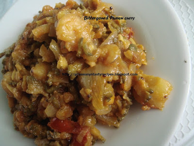 Heat oil in a kadai, add the mustard seeds n urad dal n let them splutters..add the chopped onion n chopped tomatoes, cury leaves n stir them until they get cooked..add the washed prawns to them n fry until they change the colour, add the bittergourd pieces to them also add the redchilly powder, coriander powder n salt...toss everything well, i wont add water, usually i cook them in simmer with lid closed...cook until they get well cooked n put off the stove until the oil get separates...
