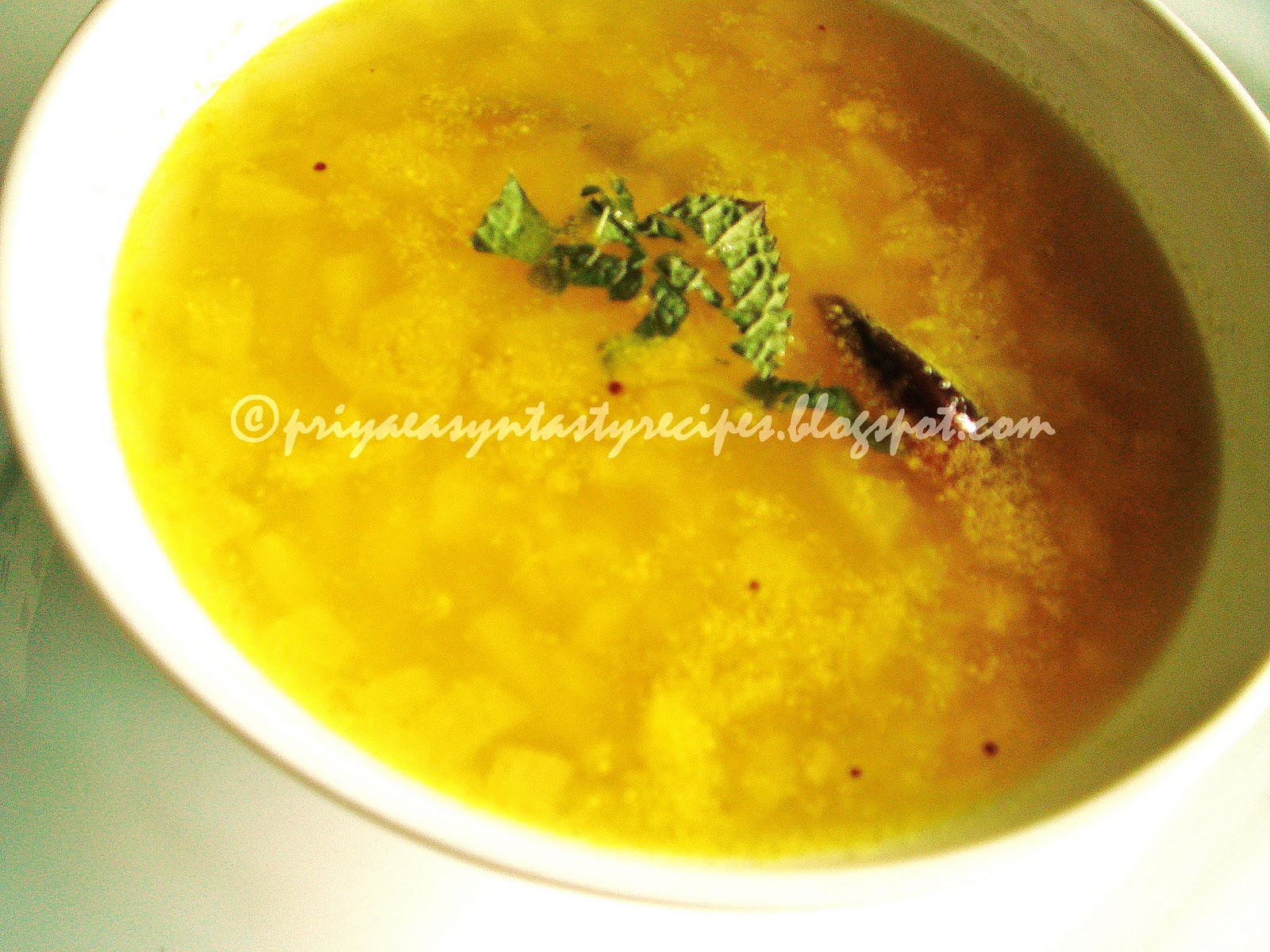 Take the cooked moongdal with water, salt, turmeric powder and few curry leaves, bring them to boil, while the dal is cooking, heat enough oil in a pan, add the mustared seed,s cumin seeds and methi seeds and fry until they turns brown, add the remaining curry leaves, red chillies and asafoetida powder..immediately add the onions and green chillies saute for few minutes and add this tempered veggies to cooking dal water, cook everything again for few minutes, put off the stove..