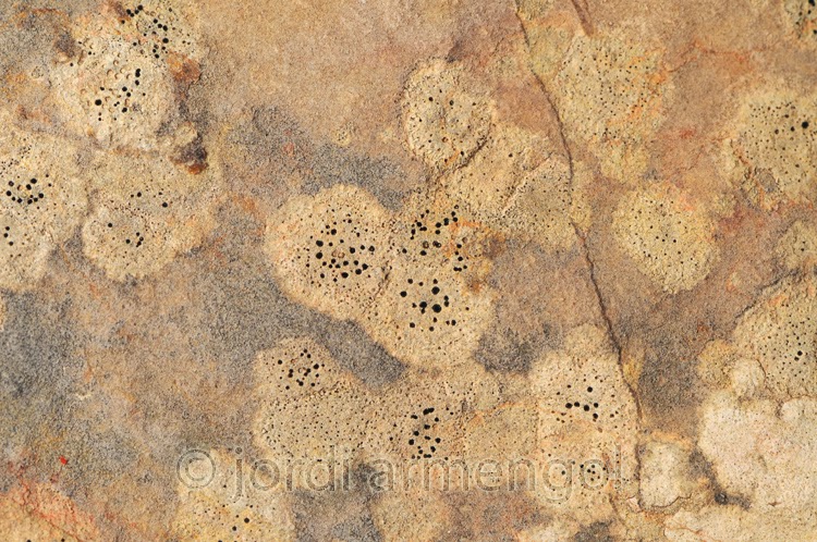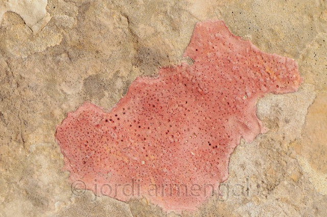 Es tracta però d'un retall a mida real de la imatge següent, un líquen anomenat Verrucaria marmorea fotografiat als Ports.
