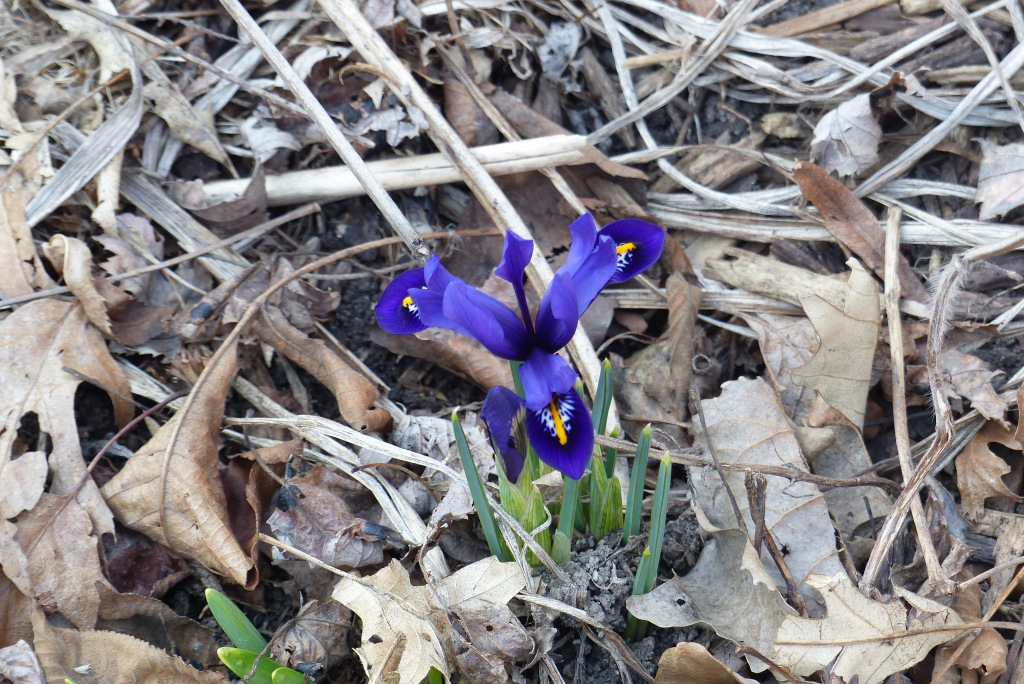 As someone who is on the lookout for signs of spring as early as February, I think I can say the season is stubbornly late this year.  As I take my daily walks, my eyes are straining to see wisps of wildflower foliage, but very little has poked through the leaf cover, especially considering that, at this time last year, there were not just leaves but open blooms. Likewise, the daffodils have formed buds, but not one has opened, though my longing looks at the dwarf iris stems finally were rewarded with blooms – but approximately two weeks later than last year.