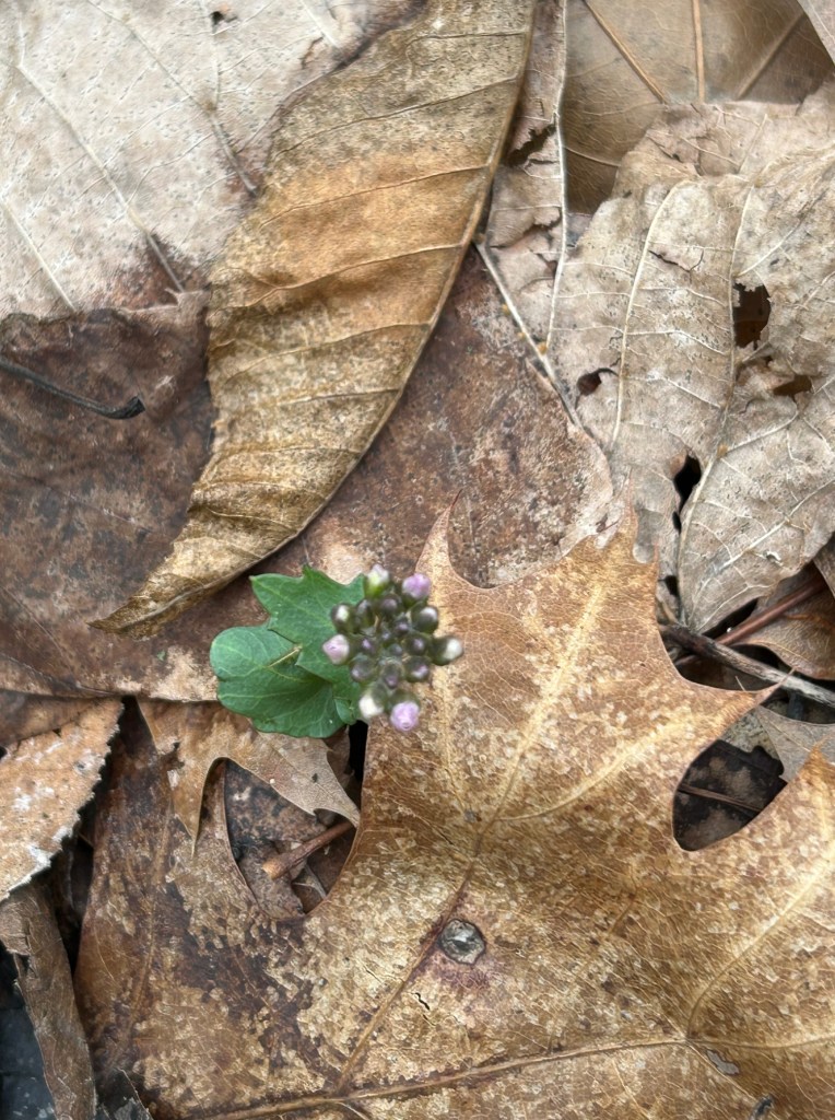 The tiniest buds of Spring Cress poking hope through the leaf cover.