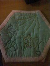 so for a while now i have been doing quilting stuff. i have started a quilt as you go single bed quilt for my sister and have done other ones for charity and have many things in the works and on my to do list. i joined a forum about 6 months ago thats all about crafts so ive been able to talk to other people doing the same things. i recently joined a hexagon swap for quilt as you go also referred to as framed hexagons. i was sent the template and contact list and got very excited about the idea. so i designed and completed my hexi but sadly it didnt make it through the post to my partner so instead im just posting a picture on the forum for her and will make her another one next month.