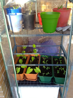 I picked up this little greenhouse a couple of weeks ago from one of my neighbours and the following saturday picked up some carnation, bean and pea seeds and carrot tape and started planting. 10 days later and this is what I have so far. The carrots are in the bottom box but won't be there long because my beans are getting very tall so I need to rearrange the shelves again.