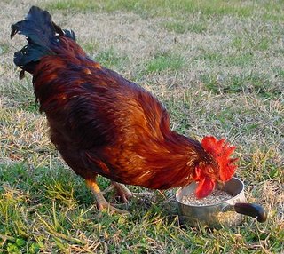 Big Red, the Rhode Island Red, decided he'd like to be the new boss. It worried me. He began acting aggressively, and though I had so far been able to bluff him into backing down, I feared we'd have to butcher him. An agressive rooster that large was NOT something I wanted to keep.