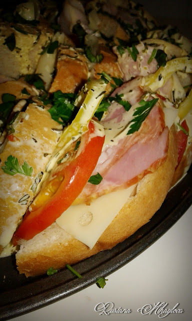 Филийките хляб се нареждат ветрилообразно във форма за кекс. Маслото се разтапя и се смесва със скълцаните пресни подправки. Разбърква се и се разпределя върху хляба. Помежду филийките се нареждат нарязани доматчета, чушка, бекон, нарязан на фино и слайсове ементал. Разбиват се яйцата, смесени със сметаната. Подправя със сол на вкус и също се разпределя върху хляба. Запича се до готовност. Добър апетит!