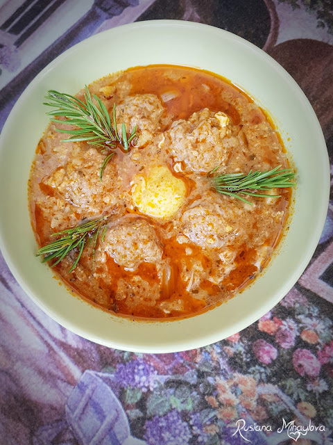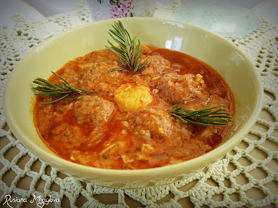 В тенджера се налива олио, лукът се нарязва ситно и се запържва. Добавят се моркова, оформените от каймата кюфтенца и се задушава за 3-4 минути. Доматите се настъргват на ренде и заедно с пастата се прибавят. Разбърква се, подправя се със захарта, солта, черния, червения пипер, дафиновия лист, чесъна и магданоза. Наливат се водата, виното и след като заври течността се чукват яйцата. Слага се капак и се готви на слаб огън около 20-25 минути. Добър апетит!