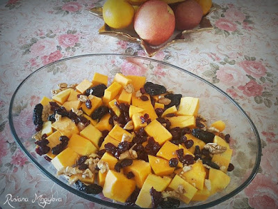 Тиквата се почиства, обелва и нарязва на кубчета. Подреждат се в тава, заедно със сушените плодове и орехите. Яйцата се смесват с прясното мляко, меда и ванилията. Разбиват се до еднородност и тиквата се залива с млечната смес. Поръсва се със захар и се запича в загрята фурна на 180 градуса за 40 минути. Да ви е сладко!