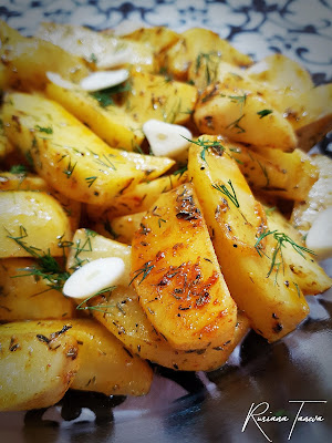Обелете, измийте и нарежете картофите. В тенджера сгорещете маслото и ги сотирайте. Прибавете сол и черен пипер на вкус, добавете червения пипер и куркумата. Разбъркайте и пресипете картофките в тава или йенски съд. Поръсете с нарязан ситно копър и фино скълцани скилидки чесън. Загрейте фурната на 190 градуса, налейте около 50 милилитра вода и изпечете ястието за 40-50 минути. По желание може да сложите фолио или йенски капак по време на готвенето. Поднесете картофите топли, гарнирайте ги със сос по ваш избор, аз ще използвам чеснов. Добър апетит!