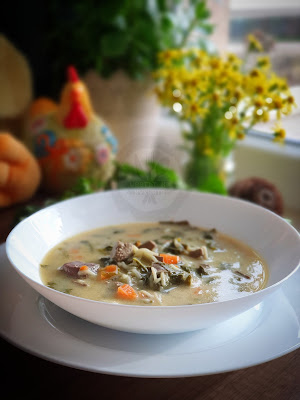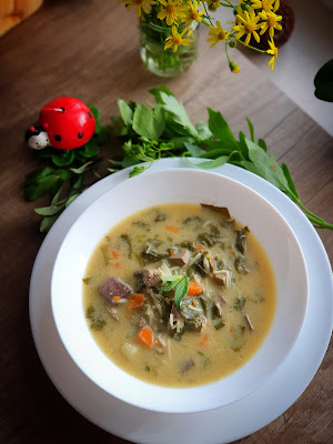 Сварете дреболийките, отцедете бульона и оставете настрана. Запържете в мазнина нарязан ситно зелен лук, джоджен, девесил и добавете предварително попарен и наситнен лапад. Сложете моркова, картофа и прибавете дреболийките, подправете със сол, черен пипер, червен пипер на вкус. Налейте отцедения по-рано бульон и сложете фидето. Оставете супата да ври за 30 мин. Застройте я с половин кофичка кисело мляко, сок от половин лимон и жълтък. Поднесете топла! Добър апетит!