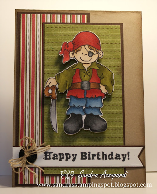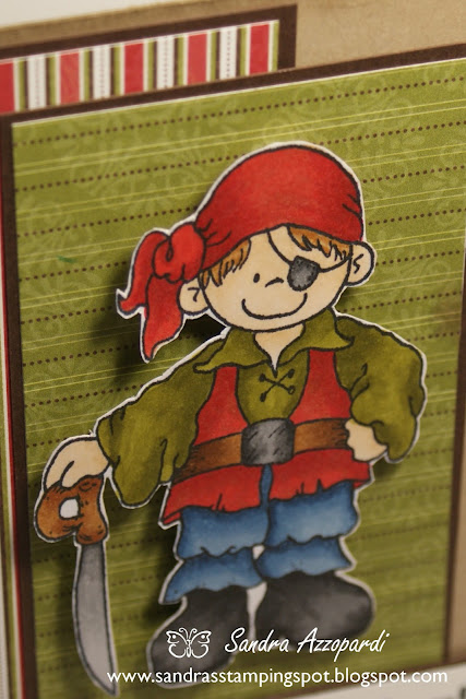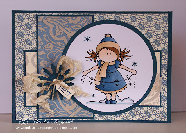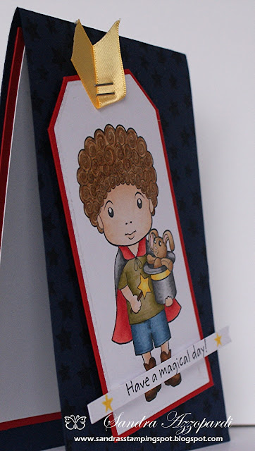 I printed out the image onto X-Press It blending card and then coloured it in using my copics. I then die cut it out using Nestabilites Labels 10 and sponged the background with SU! Bashful Blue ink. The Basful Blue cardstock base has been embossed with SU! polka dot embossing folder. The stripes are some patterned paper from my stash that have been layered onto some So Saffron cardstock.