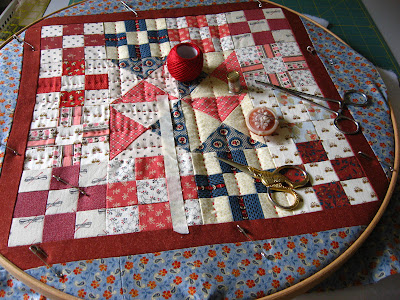 Here's the proof. I had to quickly look for a quilt which will fit my gigantic hoop and which was already basted. I remembered I had one that fits the description which was destined for machine quilting, long time ago. I've been hand quilting a little every day and it's so enjoyable. My stitches are far from even and even further from small. But as Sarah wisely says ... practice!. So now I may get all those quilt tops finally quilted. That's the plan.