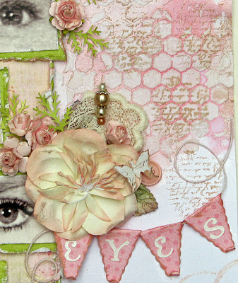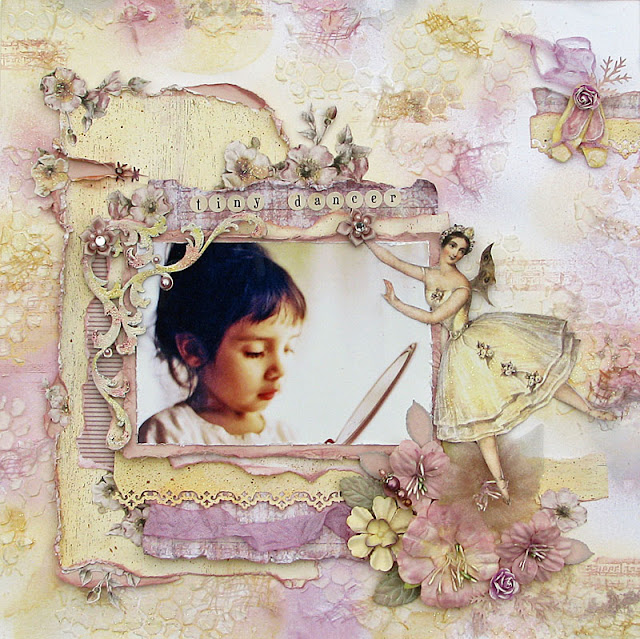 I so love using molding paste to give a page some texture and interest, and I used the lightest colors in the Special Edition Palette to help me set the tone. I also used Mistra Hoolahan's rose tutorial using Donna Salander's Rose die cut for the larger roses in the Prima Nature/Fairy paper line collection. Oh, you must give this sketch and try and see what wonderful magical powers it gives your page.