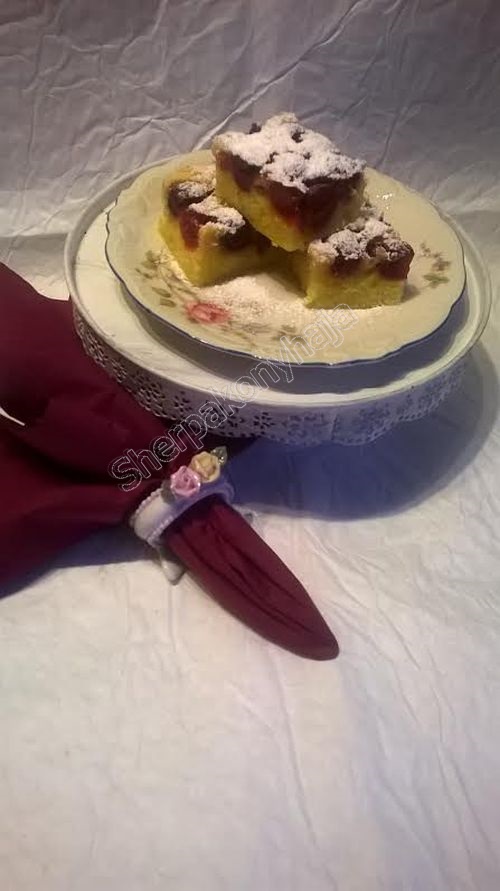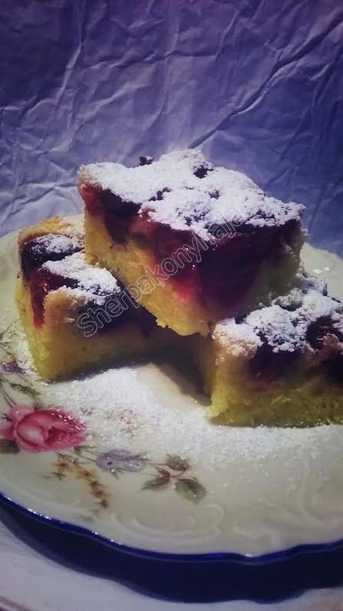 28 dkg puha vajat habosra keverek 28 dkg cukorral. Egyenként beledolgozok 3 tojást és 3 tojássárgáját. Belereszelem 1 citrom héját, majd hozzászitálok 28 dkg lisztet. Vajazott, lisztezett tepsibe simítom és kirakom 1 kg magozott meggyel. (szeretem, ha sok meggy van benne). 180 fokos sütőben világosra sütöm. Kihűlés után kockákra vágom és meghintem porcukorral.