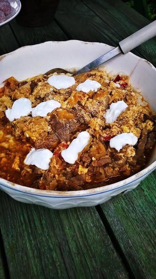 Sertéstarját csíkokra vágtam. 2 nagy fej hagymát felkockáztam, megdinszteltem. Rádobtam a húst, sóztam, borsoztam, kevés őrölt köménnyel megszórtam és átpirítottam. Volt még egy üveg tavaly eltett lecsóm, azt ráborítottam és fedő alatt puhára pároltam benne a húst. A végén 5 felvert tojást adtam hozzá és azzal még 5 percig sütöttem. Közben nokedlit főztem ki és az egészet tejföllel meglocsolva tálaltam.
