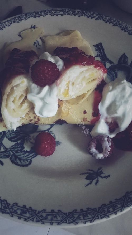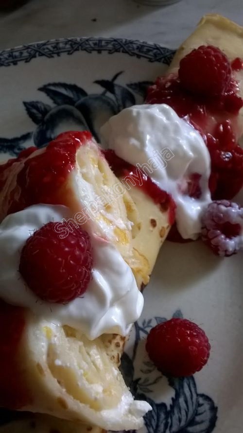 Gyümölcsdömping van, ezt igyekszem is kihasználni. Ma palacsintát sütöttem. Őszibarackos túrókrémmel töltöttem meg és málna öntettel csurgattam le. :)