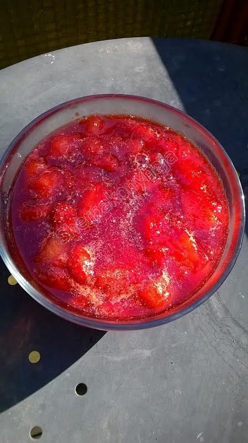 Már nem nagyon van eper, de még vettem egy kilót, meg egy mézédes sárgadinnyét, ebből sárgadinnyés eperlekvár készült: