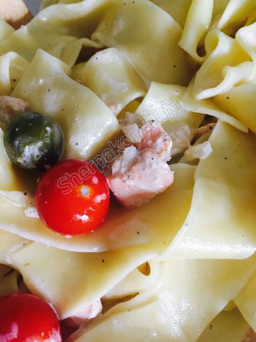 Hozzávalók: 500 g tagliatelle, 350 g lazacfilé, 2 dl fehérbor, 2.5 dl habtejszín, 1 fej vöröshagyma, cseresznye paradicsom, kapribogyó, parmezán, só, bors