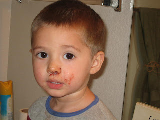 We have all been suffering from allergies in our house this past week. Dane usually wakes up all boogery but the other morning this is what he looked like. Poor kid got his first bloody nose in the middle of the night and it was all crusted to his face by morning.