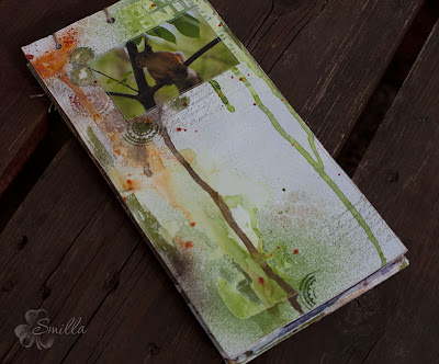 Странички я не стала склеивать попарно, с обратной стороны каждой страницы дома пришила бумажку, от души забрызганную спреями, и буквально парочкой штампов украшенную.