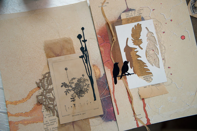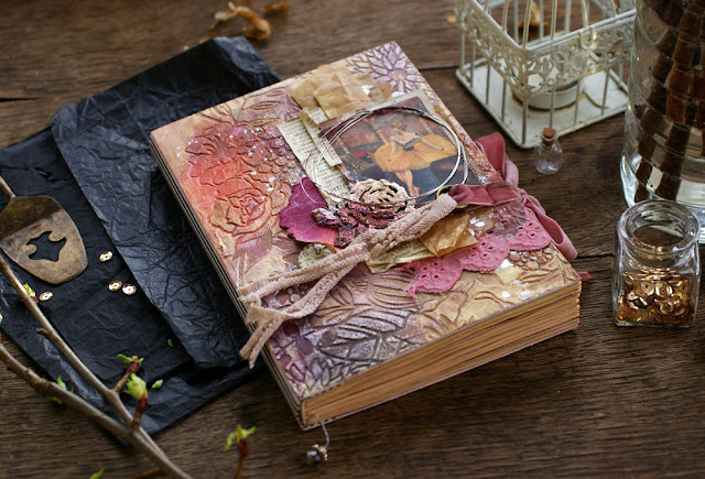 Рельеф на обложке сделан с помощью гладкой текстурной пасты, нанесенной через трафарет, покрыт грунтом и покрашен спреями. Я использовала много спреев: Танго, Фиалка, Мокко, Ночные огни, Крем-брюле, Гранат, Слива