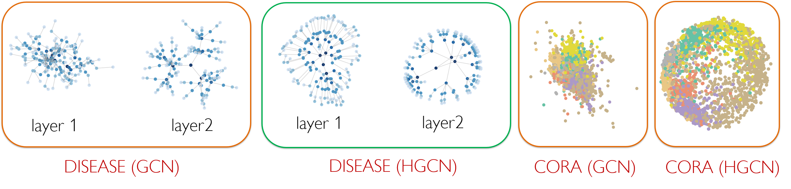 Finally we perform non-linear activation and transformation of the embedding to next layer embeddings, which are in a hyperbolic space with a different curvature. We comprehensively evaluate our experiments on a variety of networks, on both node classification and link prediction tasks, in transductive and inductive settings. In the following, we show the first layer and second layer embedding of the disease tree dataset for both GCN and HGCN (in 2 dimensions). HGCN can map the nodes to embeddings of different hyperbolic space with different curvature at each layer, resulting in low distortion embedding for hierarchical data. We also show the comparison of embedding for CORA dataset in low dimensions, showing that hyperbolic embeddings are more superior compared to Euclidean GCN embeddings when embeddings have low dimensions.