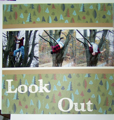 This layout is one of my favorites because it is totally Jimmy. We were out taking his Sr. Pictures, he had climbed a tree so I could get several pictures of him in the tree. He is taking Natural Resources at the local Career Center and part of his class work deals with trees. Not to mention he has always been a climber and a clown. After our photo shoot, Jimmy was goofing off and decided to stage a "I'm falling" look to scare his mom. He didn't scare me but I did manage to capture the whole scene on film and thought a story layout was perfect. This layout isn't quite finished as I plan on adding one of the Art Philosophy Trees to the Below page and of course I plan on eventually adding some journaling.