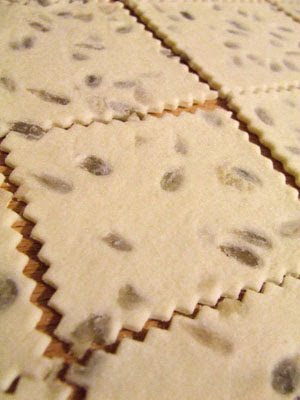 Ogni pezzo di pasta l'ho ripiegato su se stesso due volte dopo averlo infarinato, per ottenere un effetto semisfogliato, sulla spianatoia mi piace usare la semola perchè è più ruvida, ho steso più sottile possibile col mattarello, considerato che i semi fanno spessore, poi ho tagliato in quadrati e infornato a 180 gradi (diciamo a come gira al mio forno in quel momento perchè effettivamente ho notato spesso che fa un po' come gli pare e leggendo qui ho anche capito il perchè).