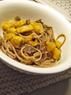 Ho scaldato dell'olio evo con semi di cumino e anice e aggiunto zenzero e aglio grattugiati con la grattugina salentina di ceramica. L'alga himantalia l'avevo messa a bagno un paio d'ore prima, l'ho tagliata e pezzettini ed aggiunta anche quella, ho fatto cuocere 5 minuti circa con un mestolo di acqua della pasta. La zucca l'avevo cotta in forno senza niente, ho aggiunto anche quella, tagliata a pezzettini, con dell'uvetta. Ho scolato la pasta e l'ho aggiunta in padella col sugo e con delle mandorle tritate.