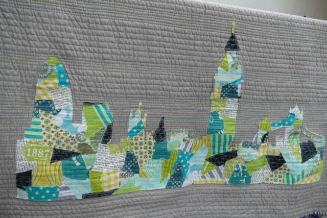 It is a fun and pretty easy technique for the most part. I loved pulling fabrics from my scraps and then cutting out the London skyline. My biggest difficulty came when I needed to appliqué the skyline to the quilt top. I didn't have any stabiliser, and so trying to satin stitch or even zig-zag stitch around the outline made everything pull out of place. In the end I just did raw edge appliqué and used some Fray Check so that hopefully all the little details won't disappear over time. I also quilted over the skyline with matchstick quilting, using three different colours of Aurifil thread.
