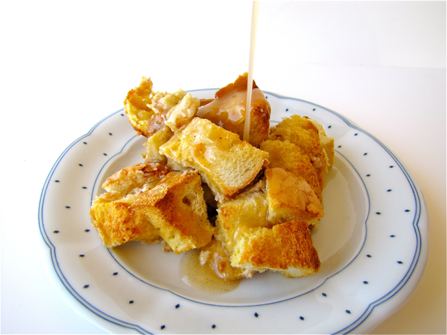 This is definitely not a weekday recipe (unless you are on vacation or you like getting up really early), but more of a weekend breakfast/brunch item. The preparation is pretty much a cinch, but you do have to let the casserole soak overnight, plus count in the baking time the next morning. French bread is cut into cubes, half of the bread is layered into a greased casserole dish before topping it with a tart apple variety (I used Granny Smith) that has been chopped. Cream cheese is then mixed with brown sugar, white sugar and apple juice until creamy and smooth and then English toffee bits are stirred in. This mixture is spread over the apples and finally the other half of the bread goes on top. The whole casserole gets an egg/milk bath and is placed in the refrigerator overnight to soak and let the flavors mingle. The next morning, after letting the dish come to room temperature, it is baked until the eggs are set. Meanwhile the apple syrup is prepared. It is simply apple juice, sugar, cornstarch, cinnamon, nutmeg and lemon juice which are brought to a boil and finally butter is incorporated.