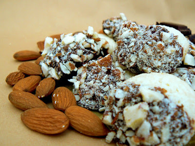 So anyway, recently I was on the pursuit of “the” perfect Amaretti recipe hoping that finally this time I would reach almond ecstasy. Well, with no surprise something went wrong in the process. Now I don’t know what exactly, but the appearance of the cookies did not turn out to be the way picture perfect Amaretti look like. The texture and the taste however were fabulous- but as I am a bit of a perfectionist who full heartedly believes in the importance of “eating with the eyes”, I decided it may be a good idea to dress up those plain looking Italian delights to make them look more appealing. To tell you the truth- in the perfect world, what I should had been blogging about were chocolate coated Amaretti with a maraschino cherry hidden in the center (that was Plan A)… but when making it, I had some ehem...“complications” which then led me to plan B- which is what I present today. Nothing more then chocolate dipped Amaretti decorated with crushed almonds. Simple, but a success with all those who tasted them- and best enjoyed with a cup of coffee, the Italian way if possible.