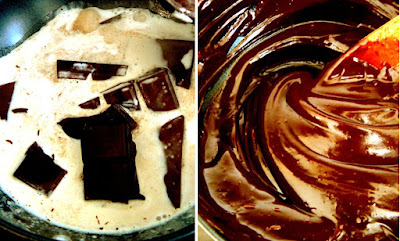 Dark chocolate melted in heated liquid cream, stirred until smooth and silky...mmm!