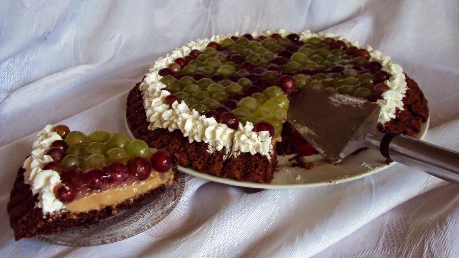 4. A szőlőt megmossuk, leszemezzük, és kirakjuk vele a torta tetejét.