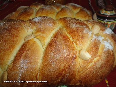 Намажете козунаците с разбит жълтък с 1с.л.мляко и поръсете със ванилена захар.Набучете бадеми.