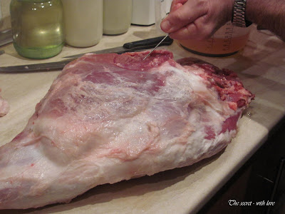 1. Вземете един цял свински бут. Почистете го от стърчащите парченца и дебелата сланина. Внимавайте да запазите целостта на ципите и оставите сланината на дебелина до 2-3 мм. Измийте го добре.