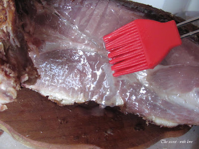 2. Измийте месото от солта. Оставете го да се отцеди и го подсушете. Намажете го с кашица от горчица, червен пипер, черен пипер, лют червен пипер, розмарин и малко вино.
