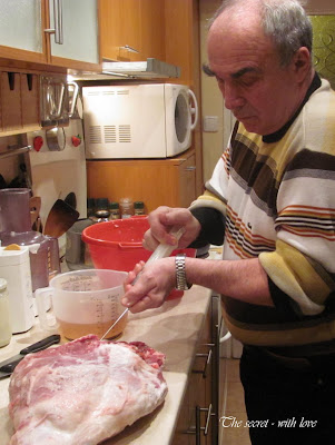1. Измийте добре месото и го подсушете напълно със салфетка. Претеглете го. Осолете го добре и оставете да престои покрито със солта - за 1 кг месо - 24 часа.