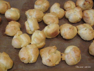 9. Прорежете изстиналите еклерчета и ги напълнете с крем като си помагате с чаена лъжичка / или чрез шприц/.