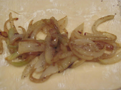 2. Разстелете бутер тестото. Разделете го на три. Разпределете лучената плънка върху него и го навийте на руло.
