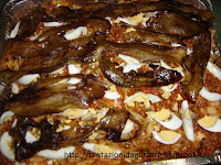 Prendere una teglia da forno, versare metà della pasta e coprirla con uno strato di uova sode , uno strato di melanzane ed uno di sottilette.