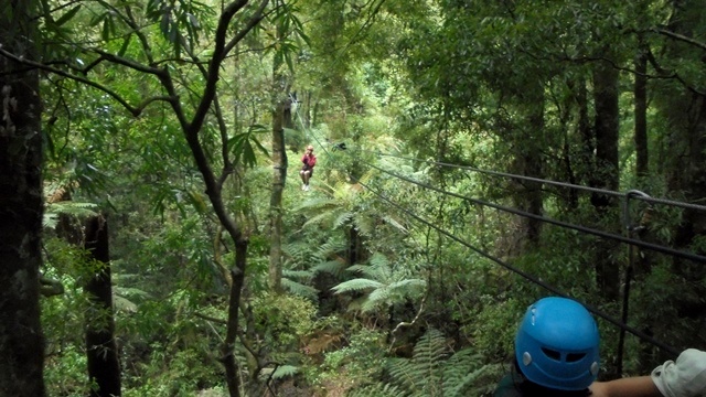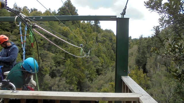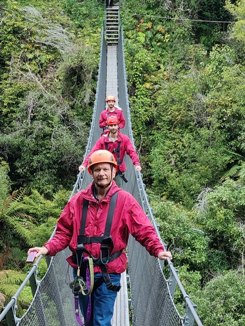 We left early Saturday morning and were there by ten. We got settled in and our first activity was something innocuously called the Rotorua Canopy Tour. It is a tour of a native New Zealand forest, except not on the ground. You traverse the forest on swing bridges, ziplines and walkways that are held up, to all appearances, by invisible skyhooks.