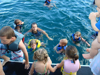 A bunch of cousins swimming off the back of the houseboat. We joked that they looked like little carp.
