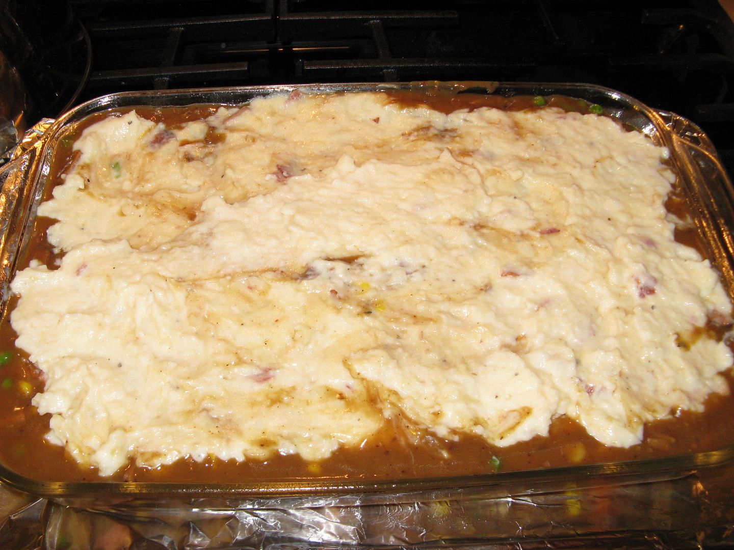 I poured the above mixture into a 9x13 pan lightly sprayed with cooking spray. Then, I took the leftover mashed potato casserole and added some milk to make it some what spreadable. You could also use freshly prepared mashed potatoes.