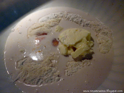 Sciogliere il panetto di lievito nell'acqua tiepida e coprire per circa 15 minuti, si formerà una leggera schiumetta in superfice.