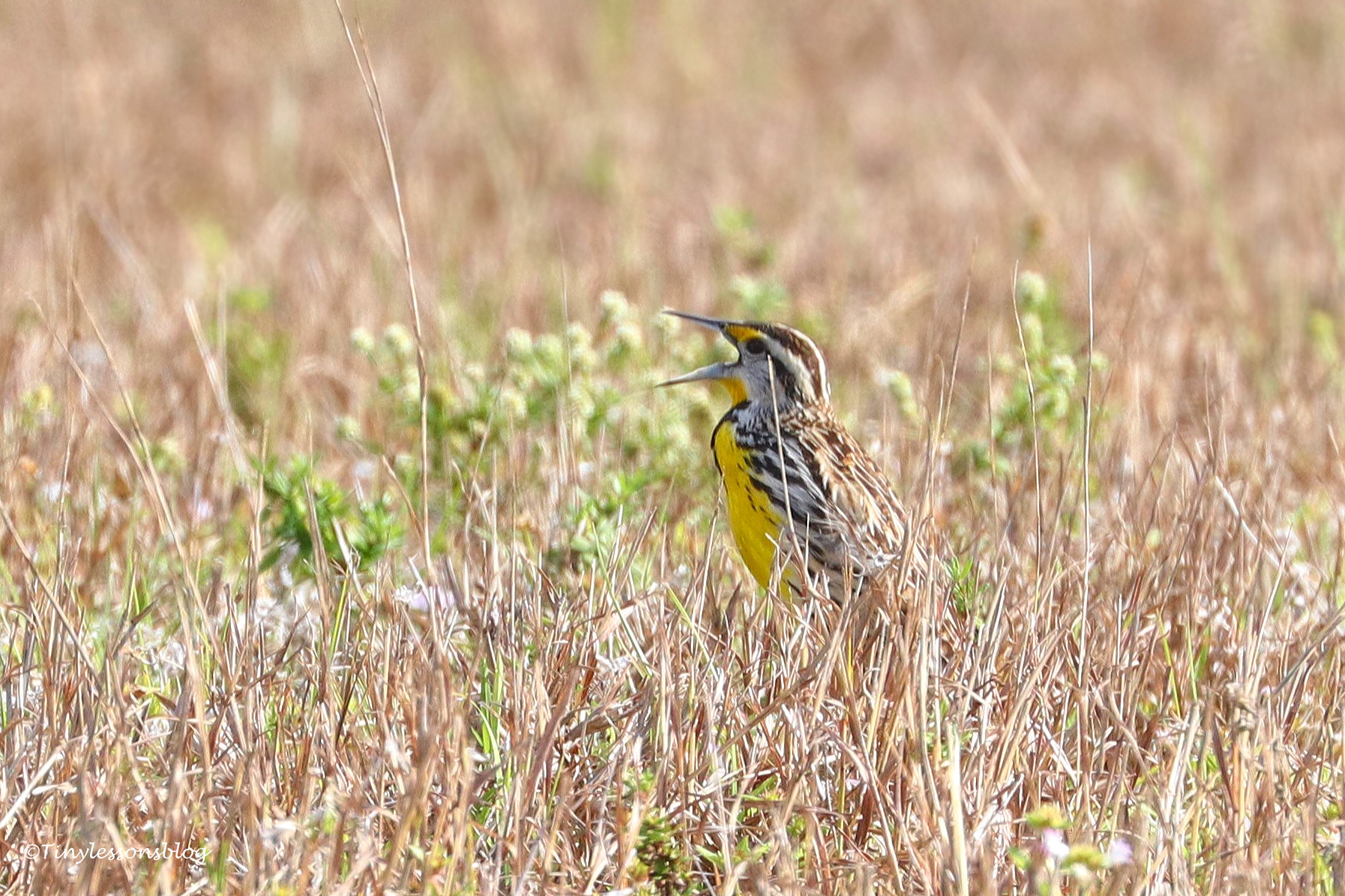 The small bus is full of photographers. And huge lenses. The knowledgeable guides are Listers. One of them currently tops the North America list of bird sightings in so far this year. They explain what we can expect to find today. And soon we are at our first stop, a field of burrows next to a football field, all marked with little T-shaped wooden lookout posts. The owls are still sleeping. But wait, someone’s out already. Daddy Burrowing Owl has fallen asleep on his guard.
