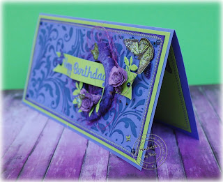 В това студено време забърках една цветна и пролетна комбинация от лилаво и зелено с пеперуди. Такова беше желанието на поръчителката. Поводът - рожден ден на 55 годишна дама.